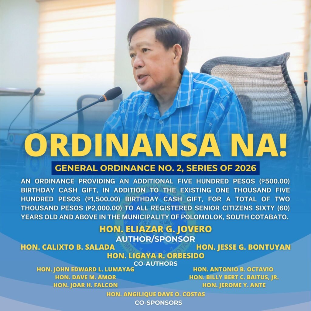 General Ordinance No. 02, series of 2026: “AN ORDINANCE PROVIDING AN ADDITIONAL FIVE HUNDRED PESOS (₱500.00) BIRTHDAY CASH GIFT, IN ADDITION TO THE EXISTING ONE THOUSAND FIVE HUNDRED PESOS (₱1,500.00) BIRTHDAY CASH GIFT, FOR A TOTAL OF TWO THOUSAND PESOS Read More …